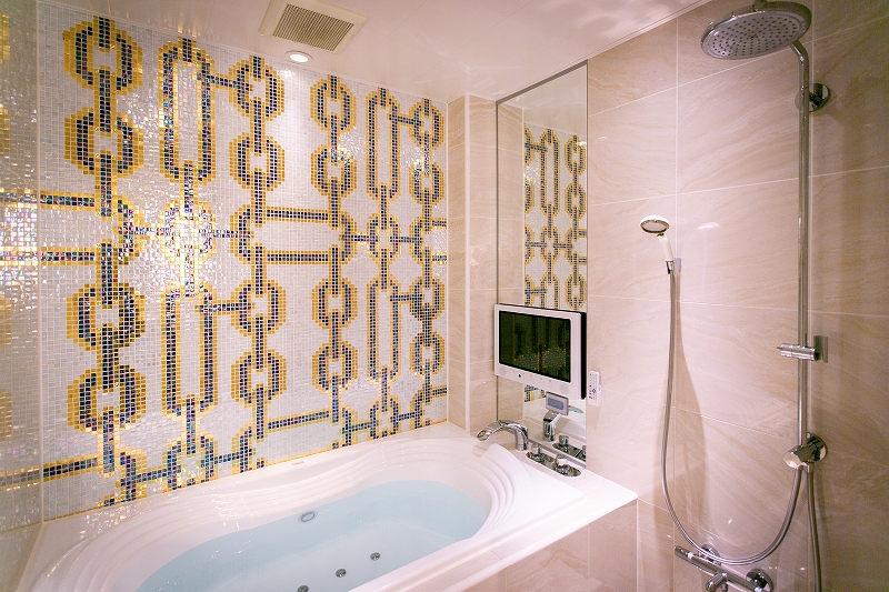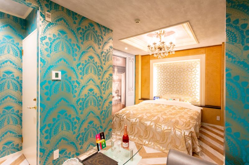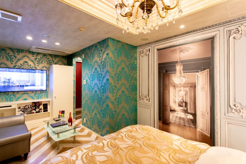 宮殿のような高級感と美しさを兼ね備えたお部屋です。壁紙のトリックアートはお二人を非日常的な世界へと誘います。