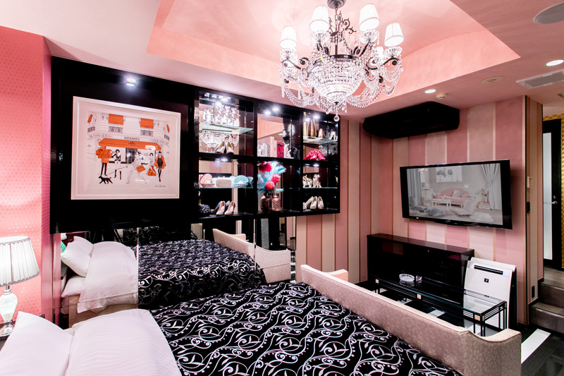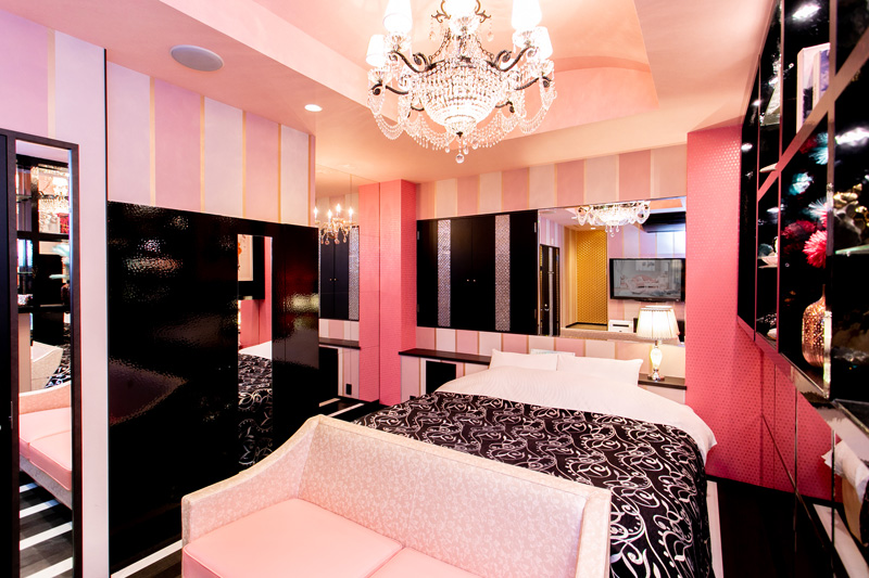 ピンク×黒をテーマとした大人かわいいお部屋です。とにかくかわいいにこだわった小物などにご注目ください。カラオケも設置しております。