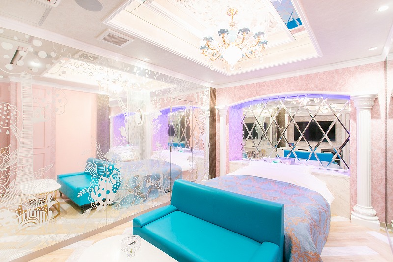 パステルカラーで統一された夢かわルームです。可愛いお部屋ですが、室内や浴室に鏡の多いお部屋となっておりますので、男性からも女性からも大人気のお部屋です。カラオケも設置しております。